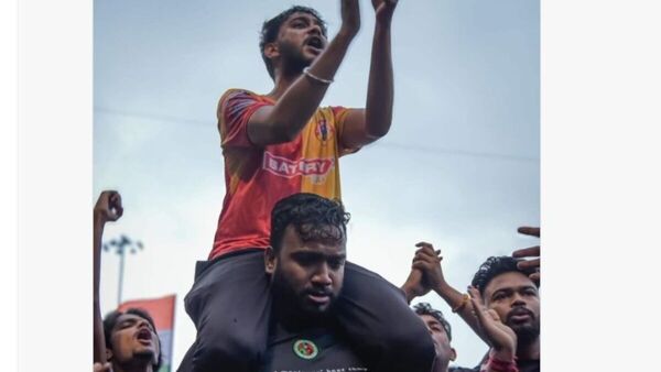 East Bengal vs Mohun Bagan Match RG Kar Protest: আরজি কর কাণ্ডকে কেন্দ্র করে গর্জে উঠেছিল কলকাতার তিন প্রধান। ডার্বি বাতিল করার পরে যুবভারতীতে প্রতিবাদে ফেটে ওঠে মোহনবাগান-ইস্টবেঙ্গলের সমর্থকেরা। তারা গর্জে উঠে বলতে শুরু করে ‘দুই গ্যালারি এক স্বর, জাস্টিস ফর আর জি কর।’ সেই সময়ে একটা ছবি দারুণ ভাবে ভাইরাল হয়ে যায়। দেখা যায় এক মোহবাগান সমর্থকের কাঁধে উঠে প্রতিবাদের গর্জনকে আরও জোড়াল করছেন এক ইস্টবেঙ্গল সমর্থক। এই ছবি কলকাতা ময়দানে প্রতিবাদের এক অন্য ভাষা তৈরি করেছে। এরপরেই নেট দুনিয়াতে ভাইরাল হয়ে যায় মোহন-ইস্ট ভক্তদের এই ছবি।